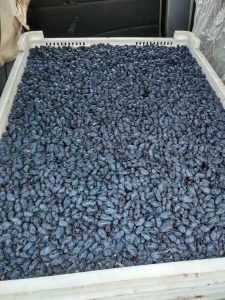 果實為漿果狀復(fù)果,柔軟多汁,形狀各種各樣,有圓形、橢圓形、圓柱形、紡錘形、鐮刀形等多種形狀。表面光滑或凸凹不平。果實從淺藍色到藍黑色,有較厚的蠟質(zhì)。果實香氣濃郁,風(fēng)味獨特,很難描述,具有藍莓、樹莓、黑加侖等漿果的混合風(fēng)味。有的品種吃起來感覺含有櫻桃、草莓、芒果、葡萄、獼猴桃的味道。果實多數(shù)是酸的,有些好品種味道酸甜或甜酸,也有很多微苦和苦澀的類型。果實長1~4 cm,寬0.6~1.5 cm,單果重0.5~2.5 g。